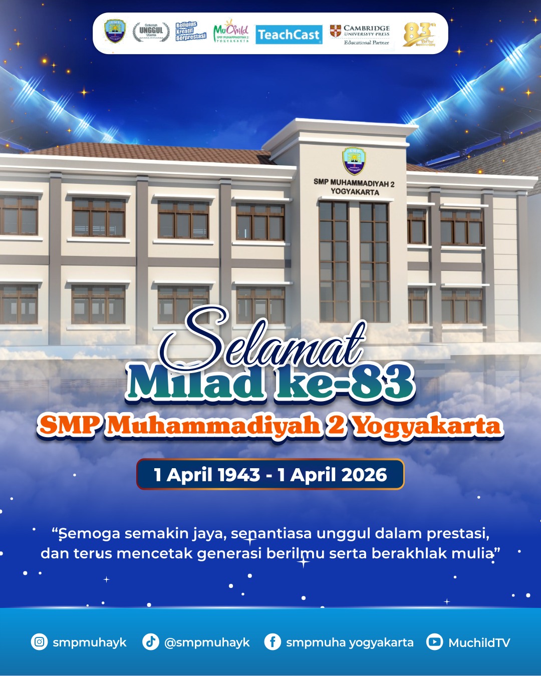 SMP MUHAMMADIYAH 2 YOGYAKARTA -SMP Muhammadiyah 2 (Mucild) Yogyakarta merayakan Milad ke-83, yang dikemas dengan Syawalan Idul Fitri 1447 H, Sabtu (28/3) di Ruang Aula lantai 3. Rangkaian Syawalan ini, juga diisi dengan tausyiah yang disampaikan Muhammad Jamaludin Ahmad, Ketua Lembaga Pengembangan Cabang Ranting dan Pembinaan Masjid (LPCRPM) Pimpinan Pusat Muhammadiyah. Kepala Sekolah SMP Muchild...Read More