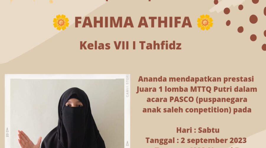 PRESTASI SISWA Alhamdulillah, semangat, selamat, dan sukses, Kami ucapkan kepada: 1. Indi Kamilia W./ Kelas IX H Tahfizh Ananda mendapatkan prestasi Juara 2 Lomba MTTQ Putri 2. Fahima Athifah / Kelas VII I Tahfizh mendapatkan prestasi Juara 1 Lomba MTTQ Putri dalam acara Pasco (Puspanegara Anak Saleh Conpetition) pada hari Sabtu, tanggal 2 September 2023 di SMA Negeri 5 Yogyakarta. Semoga selalu menginspirasi dan potensi siswa Muchild terus berkembang Views:...Baca selengkapnya