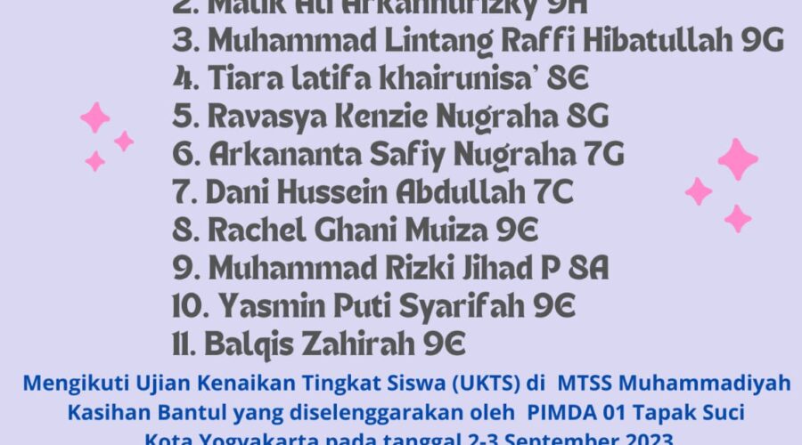 Aktivitas Siswa Bismillah Bapak Ibu,Mohon doa restu nama nama berikut: Vanessa roro anggraini 8A Malik Ali Arkannurizky 9H Muhammad Lintang Raffi Hibatullah 9G Tiara latifa khairunisa’ 8E Ravasya Kenzie Nugraha 8G Arkananta Safiy Nugraha 7G Dani Hussein Abdullah 7C Rachel Ghani Muiza 9E Muhammad Rizki Jihad P 8A Yasmin Puti Syarifah 9E Balqis Zahirah 9E Mengikuti Ujian Kenaikan Tingkat Siswa (UKTS) di MTSS Muhammadiyah Kasihan Bantul yang diselenggarakan oleh PIMDA...Baca selengkapnya