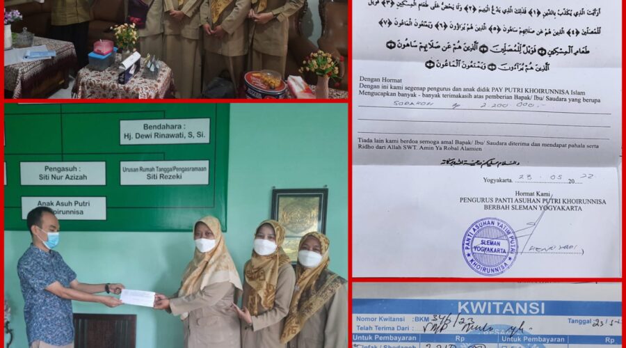 Alhamdulilah pada Jum’at 20 Mei 2022 dan Senin 23 Mei 2022, Infaq siswa kelas IX SMP Muhammadiyah 2 YK yang dikumpulkan selama pelaksanaan ASPD pada 17-20 Mei 2022 telah di sampaikan kepada 4 Panti Asuhan. Total dana yang terkumpul Rp 8.410.000 disampaikan kepada Panti Asuhan Nurul Yasmin Rp 2.000.000,-Panti Asuhan Muhammadiyah Prambanan Rp 2.000.000,-Panti Asuhan Madania Rp 2.210.000,-Panti Asuhan Khairunnisa Rp 2.200.000,- Pihak panti menerima dengan baik dan mendoakan semoga...Baca selengkapnya