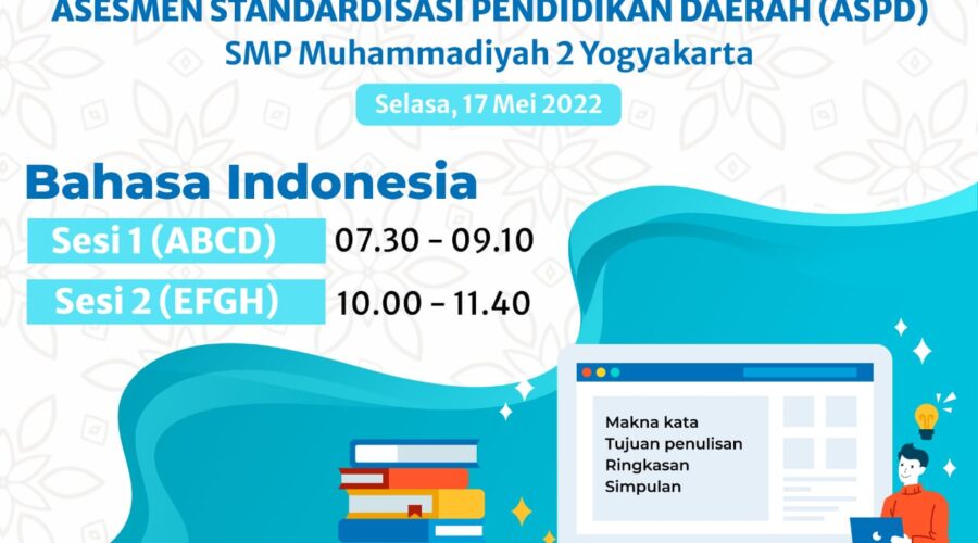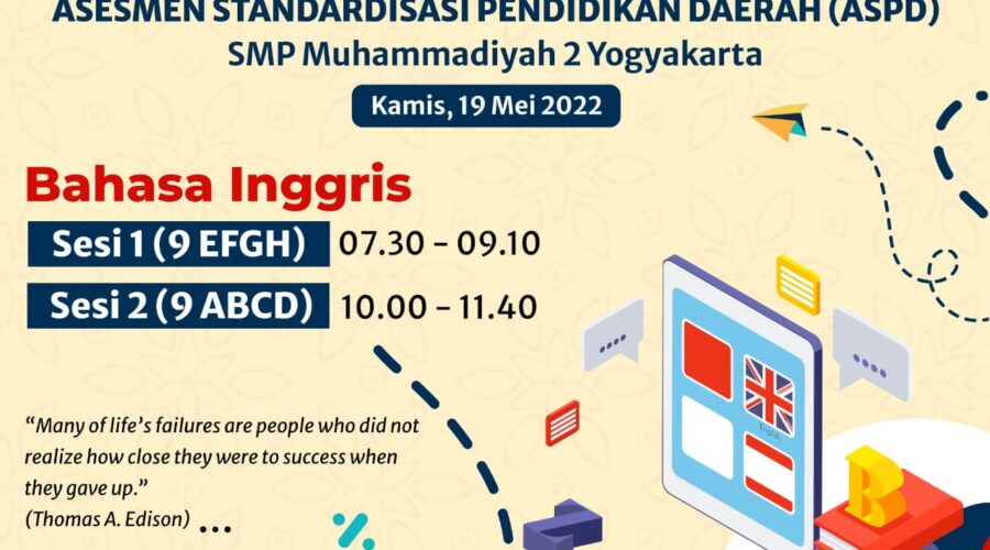 Kamis, 19 Mei 2022 Alhamdulillah para siswa tampak sudah lebih enjoy dan siap melaksanakan ujian ASPD hari ketiga mapel Bahasa Inggris. Awal kedatangan siswa langsung menuju ke Masjid untuk melaksanakan Sholat Dhuha dan tepat pukul 07.15 para siswa kelas 9 sudah terkondisikan memasuki Labkom dilanjutkan dengan doa bersama untuk mengawali ASPD Bahasa Inggris hari ketiga ini. Pada hari ketiga pelaksanaan ASPD mendapat monitoring dari Majelis Dikdasmen PDM Kota Yogyakarta Ibu...Baca selengkapnya