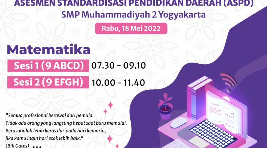Hari Kedua, ASPD Muchild Lancar Tidak Ada Kendala Rabu, 18 Mei 2022“Alhamdulillah, pelaksanaan ASPD hari kedua mapel Matematika di Muchild, berjalan lancar tidak ada kendala dan aman terkendali seperti yang diharapkan. Para siswa dapat mengerjakan soal dengan baik,” kata Kepala SMP Muhammadiyah 2 Yogyakarta, Naning Hidayati, S.Pd. Pelaksanaan ASPD hari kedua mendapat kunjungan monitoring dari Lembaga Ombudsman (LO) DIY Umbu Abidin serta Kabid SMP Dikpora Kota Yogyakarta Hasyim, S.IP. M.Acc....Baca selengkapnya