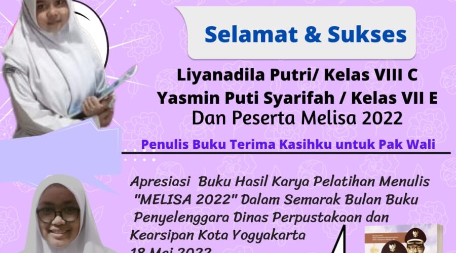 Selamat dan Sukses✅ Liyanadila Putri/8C✅ Yasmin Puti Syarifah /7EDan Peserta Melisa 2022Sebagai Penulis buku :Terimakasihku Untuk Pak Wali.Rabu, 18 Mei 2022Apresiasi Buku Hasil Karya Pelatihan MenulisMELISA 2022 Dalam Semarak Bulan BukuPenyelenggara Dinas Perpustakaan danKearsipan Kota Yogyakarta.Semoga semakin menginspirasi siswa SMP Muhammadiyah 2 YK untuk terus berprestasi, berkarya, dan berkreasi. Tetap Semangat dan Sukses Selalu Views: 6Baca selengkapnya