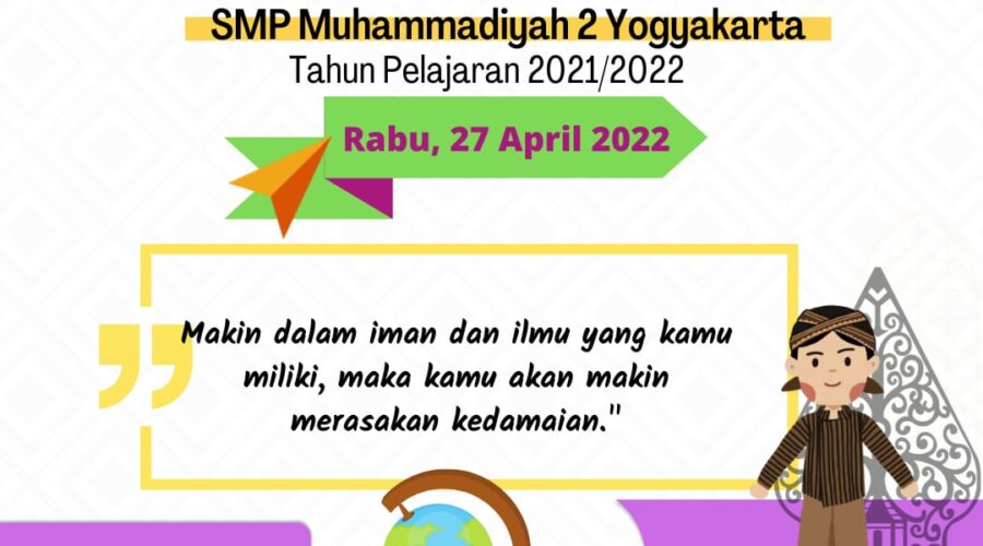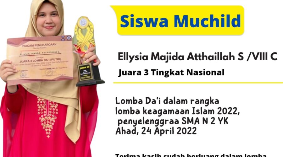 Alhamdulillah Prestasi yang Luar biasa telah diraih oleh siswi SMP Muhammadiyah 2 Yogyakarta dalam Lomba Da’i Tingkat Nasional yang diselenggarakan oleh SMA Negeri 2 Yogyakarta atas nama Ellysia Majida Atthaillah Safira/ kelas VIII C. Memperoleh Juara 3 dalam rangka lomba keagamaan Islam 2022, Ahad 24 April 2022. Dan terima kasih bagi ananda Muhammad Fachri Alif Putranto/ kelas VII E yang sudah berjuang dalam lomba kaligrafi. Semoga semakin berprestasi dan menginspirasi...Baca selengkapnya