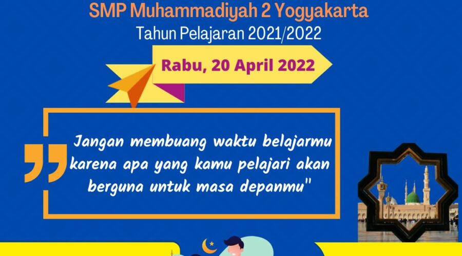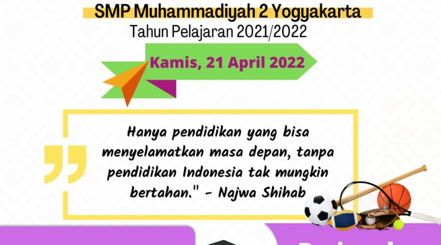 Puji Syukur prestasi yang Luar biasa telah diraih oleh siswi SMP Muhammadiyah 2 Yogyakarta dalam Lomba Islamic Story Telling Tingkat Nasional yang diselenggarakan oleh SMA Muhammadiyah 2 YK atas nama Jacinta Kastra Syazwani kelas VII Unggulan Bahasa. Jacinta kastra Syaswani memperoleh Juara 3 Dalam rangka Moera Challenge 2022. Sekolah juga mengucapkan terima kasih bagi ananda Baby Athaya Syah kelas VIII F yang sudah berjuang dalam lomba poster di event...Baca selengkapnya