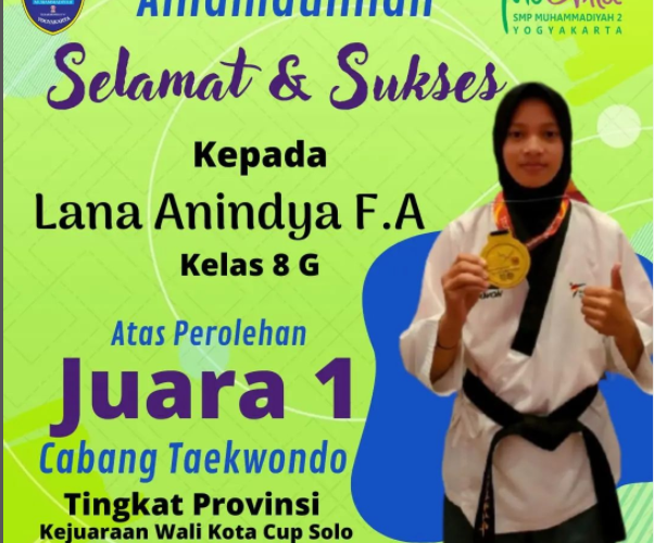 Kabar gembira,*Alhamdulillah*, Prestasi yang Luar biasa telah diraih oleh siswa _SMP Muhammadiyah 2 Yogyakarta_ dalam event *Kejuaraan Bupati Solo Cup* Atas Nama :💠 *Lana Anindya FA* (8G)Cabang *Taekwondo* _Juara 1_ Semoga semakin meningkat dan dapat menambah motivasi serta menjadi inspirasi bagi siswa yang lain untuk berprestasi, berkarya dan berkreasi. *Terima kasih atas support dan doa dari semua pihak* Views: 10Baca selengkapnya