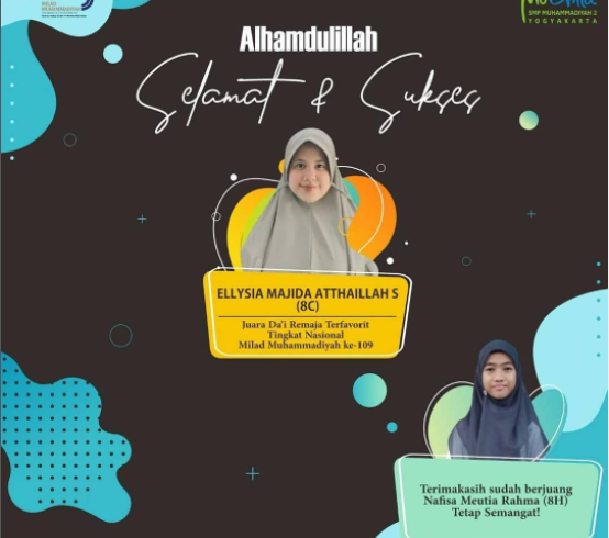 Alhamdulillah, selamat dan sukses Ellysia Majida Atthailllah Kelas VIII C, Mendapat Juara Dai Remaja Terfavorit ingkat NasionalTerus mengukir prestasi dan karya kembangkan bakat dan potensi siswa SMP Muhammadiyah 2 Yogyakarta. Views: 18Read More