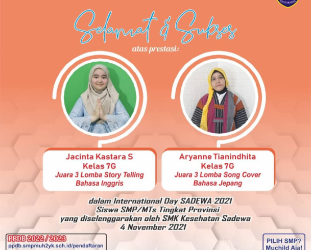Alhamdulillah, selamat dan sukses Jacinta K dan Aryabe T kelas VII G Bahasa juara lomba Cover Lagu dan Song Cover Bahasa JepangTerus mengukir prestasi dan karya kembangkan bakat dan potensi siswa SMP Muhammadiyah 2 Yogyakarta. SMP Muhammadiyah 2 Yogyakarta, sekolah para juara🏆 Views: 2Read More