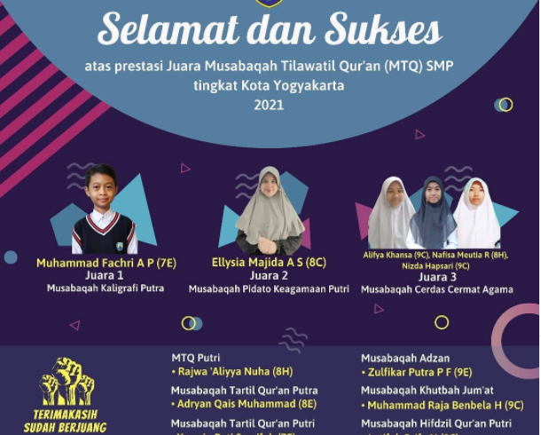 Alhamdulillah kabar gembira atas prestasi non akademik yang diraih para siswa SMP Muhammadiyah 2 Yogyakarta. Selamat dan sukses kepada para pemenang dalam rangka Lomba Musabaqah Tilawatil Qur’an (MTQ) Tingkat Kota Yogyakarta , yaitu: 1. Muhammad Fachri Alif Putranto (7E) juara 1 lomba Musabaqah Kaligrafi Putra...Read More