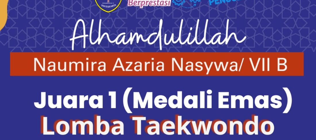 Kabar Prestasi Muchild Alhamdulillah, Selamat, Semangat, dan sukses atas prestasiNaumira Azaria Nasywa Kelas 7B Lomba Taekwondo Tingkat International memperoleh juara 1 (medali emas)Dalam Event WAEIN Cup, Open Championship tanggal 12-14 Januari 2024 di Our Tampines Hub-Team Sport Hall Singapura Terima kasih atas doa dan support...Read More