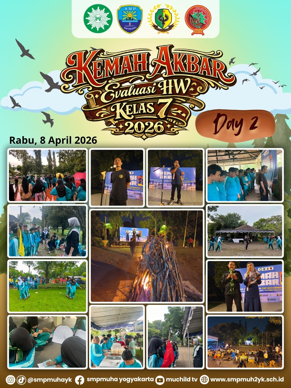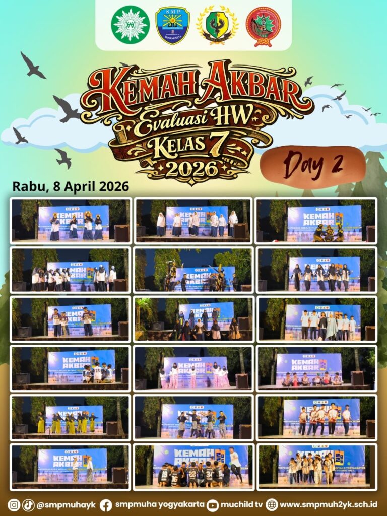 Kegiatan Kemah Akbar Evaluasi Hizbul Wathan (HW) kelas 7 tahun 2026 yang diselenggarakan oleh SMP Muhammadiyah 2 Yogyakarta memasuki hari kedua (Muchild Day 2) dengan suasana yang semakin meriah dan penuh kreativitas. Setelah melalui berbagai rangkaian kegiatan di hari pertama, puncak acara pada hari kedua difokuskan pada malam kreasi dan pentas seni yang melibatkan seluruh siswa kelas 7, mulai dari kelas 7A hingga 7I.