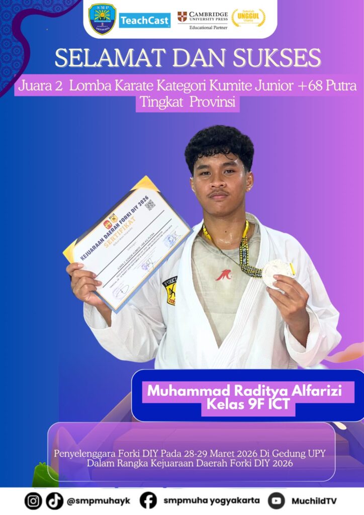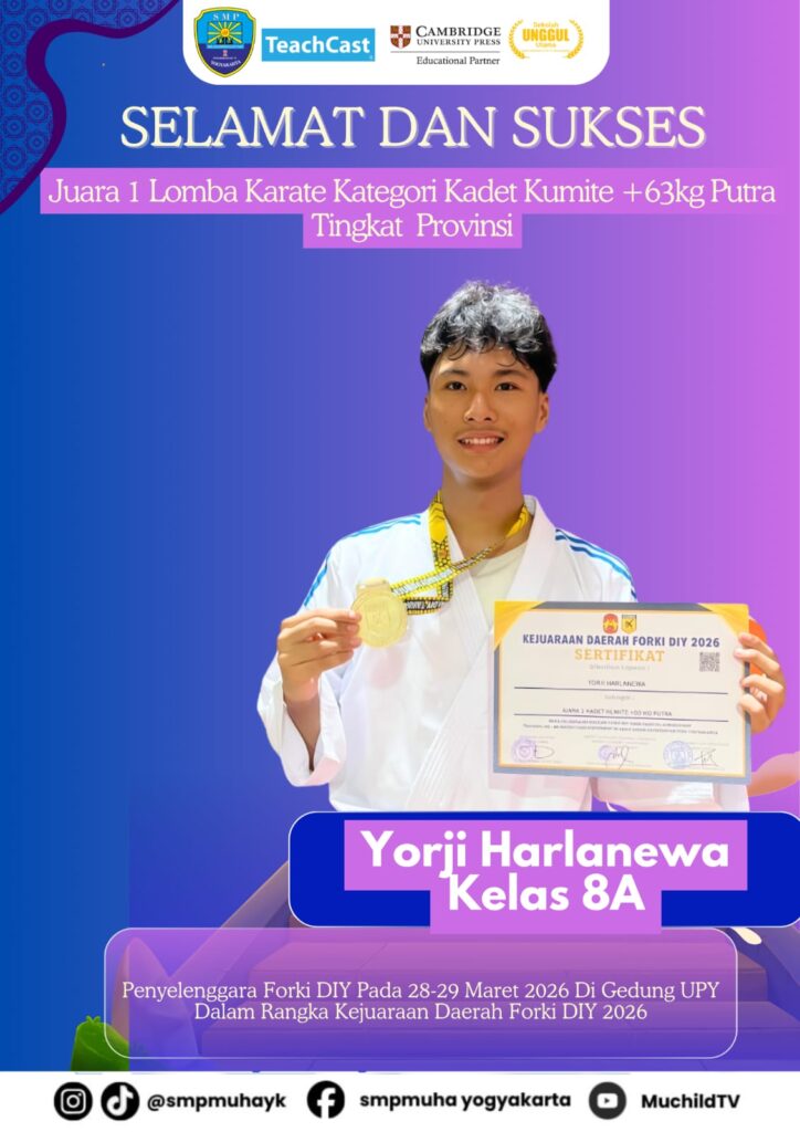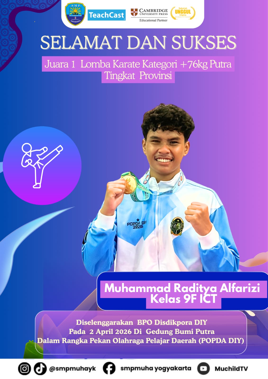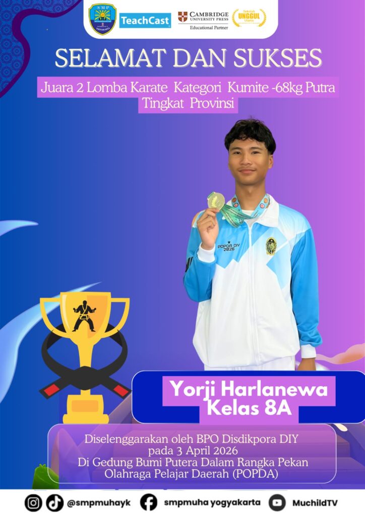Yogyakarta — Prestasi membanggakan kembali ditorehkan oleh siswa-siswi Muchild dalam ajang Pekan Olahraga Pelajar Daerah (POPDA) Daerah Istimewa Yogyakarta tahun 2026. Dalam cabang olahraga karate, dua siswa berhasil meraih gelar juara di kategori kumite putra tingkat provinsi.