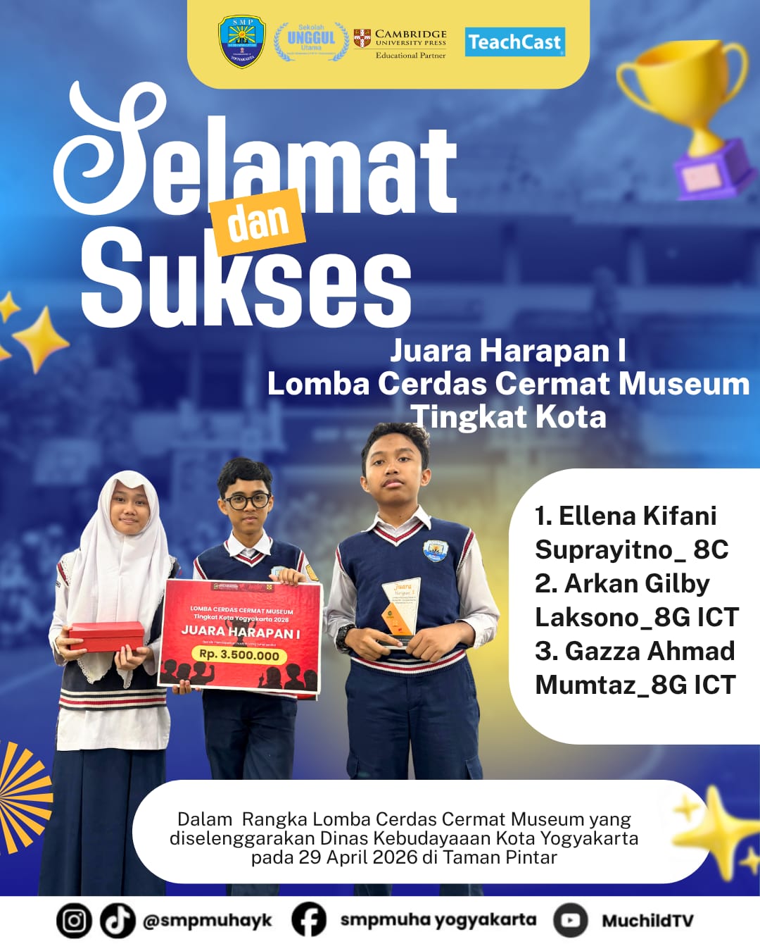 YOGYAKARTA, 29 April 2026 – Prestasimembanggakan kembali ditorehkan oleh Tim SMP Muhammadiyah 2 Yogyakarta (Muchild) dalam ajang Lomba Cerdas Cermat Museum Tingkat Kota yang diselenggarakan oleh Dinas Kebudayaan Kota Yogyakarta di Taman Pintar.