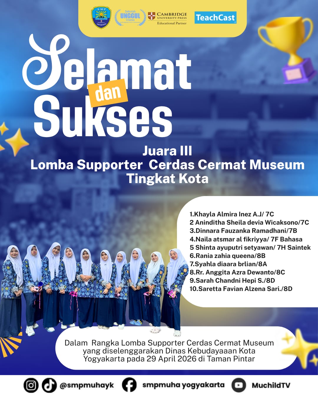 YOGYAKARTA, 29 April 2026 — Kabar membanggakan kembali datang dari SMP Muhammadiyah 2 Yogyakarta (Muchild). Tim supporter Muchild berhasil meraih Juara III dalam ajang Lomba Supporter Cerdas Cermat Museum Tingkat Kota yang diselenggarakan oleh Dinas Kebudayaan Kota Yogyakarta di Taman Pintar.